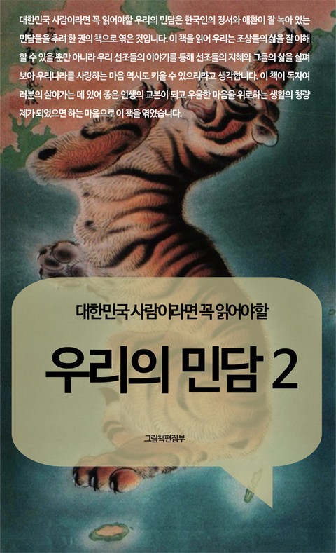 대한민국 사람이라면 꼭 읽어야할 우리의 민담은 한국인의 정서와 애환이 잘 녹아 있는 민담들을 추려 한 권의 책으로 엮은 것입니다. 이 책을 읽어 우리는 조상들의 삶을 잘 이해할 수 있을 뿐만 아니라 우리 선조들의 이야기를 통해 선조들의 지혜와 그들의 삶을 살펴보아 우리나라를 사랑하는 마음 역시도 키울 수 있으리라고 생각합니다. 이 책이 독자여러분의 살아가는 데 있어 좋은 인생의 교본이 되고 우울한 마음을 위로하는 생활의 청량제가 되었으면 하는 마음으로 이 책을 엮었습니다.