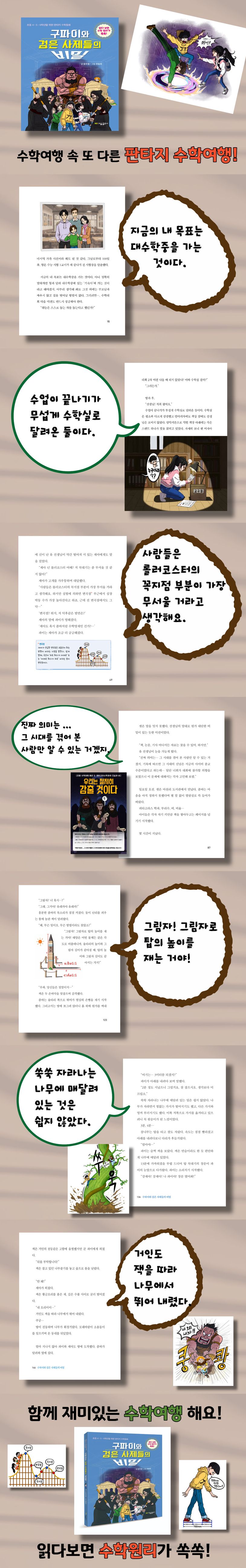 『구파이와 검은 사제들의 비밀』은 초등 4·5·6학년을 위한 판타지 수학동화 시리즈의 두 번째 이야기다. 마법의 수학 분필을 들고 떠나는 구파이의 판타지 수학여행은 이번에는 천재 수학자 피타고라스의 세계로 독자들을 초대한다. 구파이와 판타지 수학 모험의 단짝 ‘나좀바’는 대수학 중학교 입학을 위한 수학 대회에 참가해 두 번째 미션에 도전한다. 새로운 동반자 강제아와 함께 3인 1조가 된 이들은 마법의 수학 분필을 사용해 또 다른 판타지 세계로 이동한다. 아이들이 도착한 곳은 피타고라스 학파가 지배하던 세상이다. 이곳에서 아이들은 두 번째 미션을 해결하기 위해 ‘피타고라스를 알아가는 과정’을 따라 판타지 수학여행을 이어 가며, 삶을 바라보는 ‘세계관’의 중요성도 자연스럽게 깨닫게 된다. 『구파이와 검은 사제들의 비밀』은 아이들이 흥미를 느낄 수 있는 판타지 세계로 독자를 초대하며, 수학에 자연스럽게 다가가도록 돕는 작품이다. 평소 어렵게 느꼈던 수학의 원리를 동화라는 이야기 구조 안에 담아, 가랑비에 옷이 젖듯 자연스럽게 이해할 수 있도록 풀어냈다.