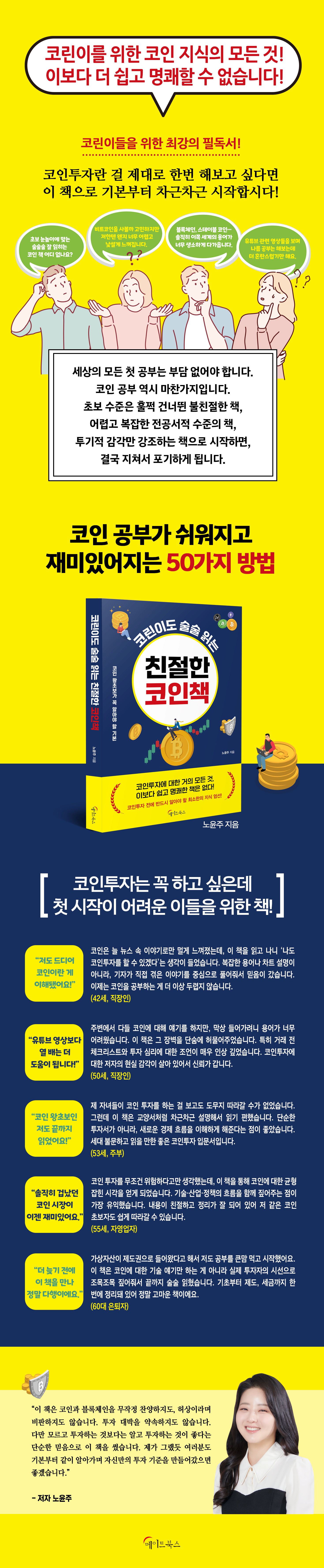 디지털자산 시장의 문턱은 여전히 높다. 수많은 용어와 복잡한 개념, 하루가 다르게 바뀌는 트렌드 속에서 초보 투자자들은 어디서부터 시작해야 할지 막막하다. 『코린이도 술술 읽는 친절한 코인책』은 바로 그 막막함을 덜어주는 책이다. 8년째 블록체인 전문 기자로 활동중인 노윤주 기자는 현장을 누구보다 가까이에서 취재하며, 코인의 기본 구조부터 실전 투자 감각까지 ‘기자가 직접 경험으로 풀어낸 코인 입문서’를 완성했다. 그는 “코인투자는 복잡하지 않다, 다만 제대로 아는 사람이 드물 뿐이다”라는 메시지로 코린이(코인 초보)들에게 첫걸음을 제시한다. 빠르게 변화하는 시장일수록 기본이 중요하다는 그의 철학은, 책 전반에 ‘기초의 탄탄함이 곧 생존력’이라는 일관된 기조로 관통한다. 이 책은 단순한 설명서가 아니라, 코인 시장에서 ‘정보에 휩쓸리지 않는 사람’이 되는 법을 알려주는 실전형 길잡이다. 코인이라는 낯선 세계를 가장 친절하게 해석한 ‘왕초보 전용 해설서’라 해도 과언이 아니다.