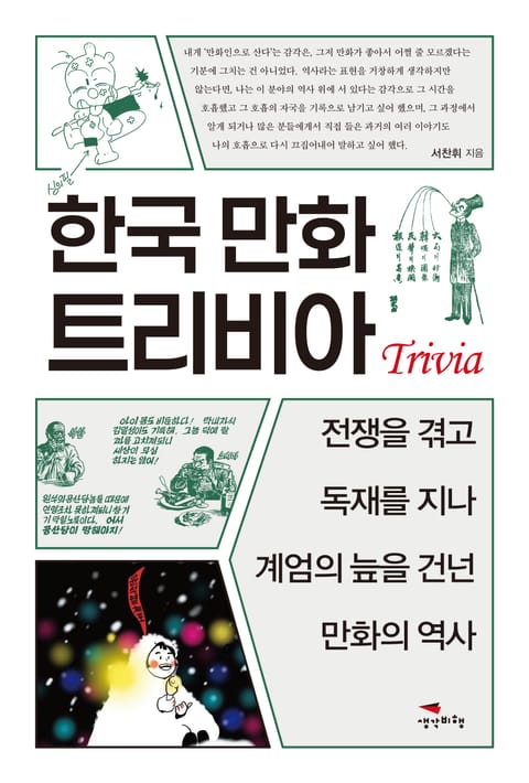 《키워드 오덕학》, 《나의 만화유산 답사기》, 《덕립선언서》 등으로 한국의 만화와 서브컬처를 기록해 온 만화비평가 서찬휘가 1945년 해방기부터 2025년 현재까지 대략 80년의 한국 만화 역사를 정리했다. 《한국 만화 트리비아》는 전쟁을 겪고 독재를 지나 계엄의 늪을 건넌 만화의 역사를 정리한 책이다. 작가는 한국 만화의 여러 시기와 사건을 통사적으로 서술하기보다는 저널이 다루듯 미시적으로 토막 내고 각기 떨어져 있는 사건 같지만 연결점이 있다고 생각하는 것들을 묶어냈다. 객관을 가장한 딱딱한 박제가 아니라 생생한 느낌으로 현장의 목소리를 담아냈다. 이 책을 읽는 독자는 전쟁, 독재, 계엄과 같은 특수한 사회 현실 속에서 한국 만화가 표현의 자유를 지키기 위해 어떻게 투쟁해 왔는지 생생하게 경험할 수 있다.