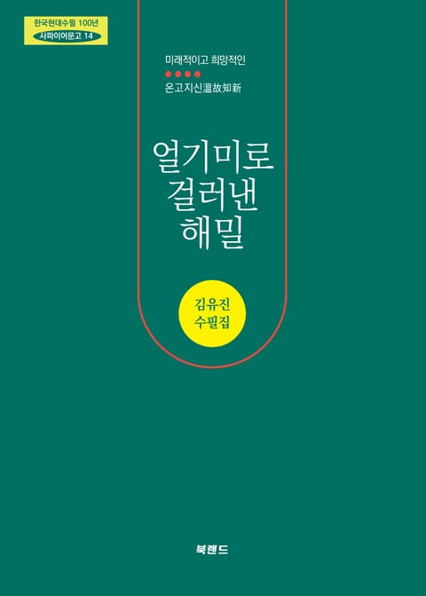 한국현대수필 100년 사파이어문고 열네 번째 책은 “미래적이고 희망적인 온고지신”의 수필을 표방하는 김유진 수필가의 첫 수필집 『얼기미로 걸러진 해밀』이다.