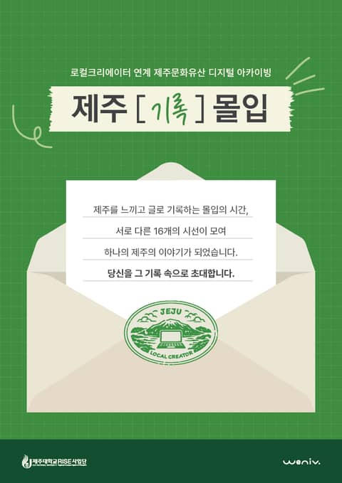 「제주, 기록, 몰입」은 제주를 직접 답사하고 각자의 언어로 기록한 문화유산 디지털 아카이빙 프로젝트의 결과물입니다. 글과 사진, 에세이 등 다양한 형식으로 담아낸 이야기들은 개인의 추억을 넘어, AI와 디지털 기술을 통해 지역과 공유되는 하나의 아카이브로 확장되었습니다.