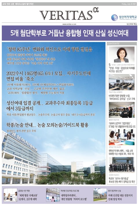 eBook <2022 성신여대 가는 길>은 교육전문신문 베리타스알파가 2022 대입을 겨냥해 발행한 별지특집을 eBook 형태로 가공한 것입니다. 올해 창학 85주년, 개교 56주년을 맞은 성신여대는 ‘민족정신을 기반으로 정성되고 믿음직한 여성지도자를 양성해 국가와 사회에 공헌한다’는 건학이념 하에 세워진 대학입니다.