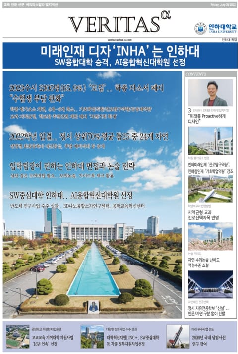 eBook <2023 인하대 가는 길>은 교육전문신문 베리타스알파가 2023 대입을 겨냥해 발행한 별지특집을 eBook 형태로 가공한 것입니다. 2023 수시 원서접수를 앞두고 베리타스알파가 특집 대학으로 선정한 인하대는 인천지역 최초 SW중심대학에 선정되고 과기부의 AI 융합혁신대학원 사업에도 선정되며 공학계열 경쟁력을 이어갑니다.