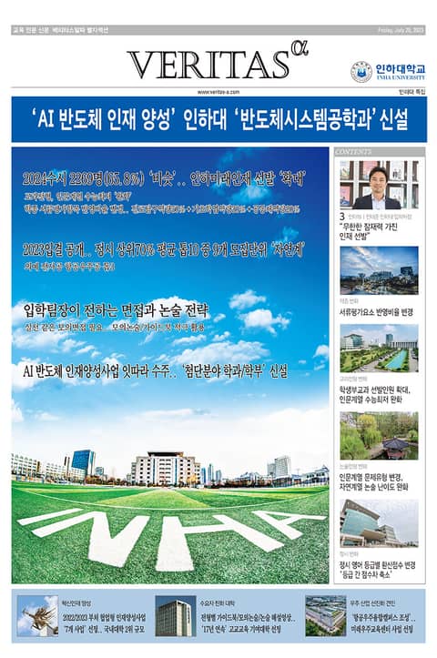 eBook <2024 인하대 가는 길>은 교육전문신문 베리타스알파가 2024 대입을 겨냥해 발행한 별지특집을 eBook 형태로 가공한 것입니다. 2024 수시 원서접수를 앞두고 베리타스알파가 특집 대학으로 선정한 인하대는 올해 반도체 첨단인재 양성을 위해 반도체시스템공학과를 신설했습니다. 바이오시스템융합학부도 신설해 첨단바이오산업을 리드할 미래인재를 육성하고자 합니다.