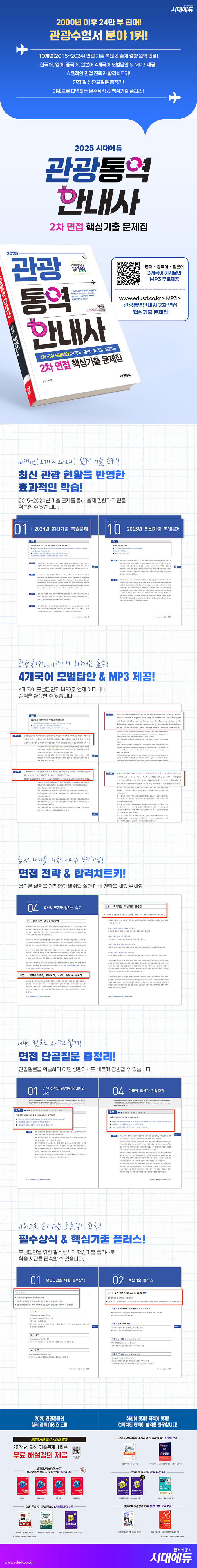 2015년~2024년 면접 기출 문제를 복원하여 실었습니다. 관광 현황은 매년 개정되는 부분이 많은 만큼 최신 자료로 학습하는 것이 중요합니다. 이에 2024년 면접 기출 문제와 관광 현황을 반영하여 출제 경향을 파악할 수 있도록 구성하였습니다.