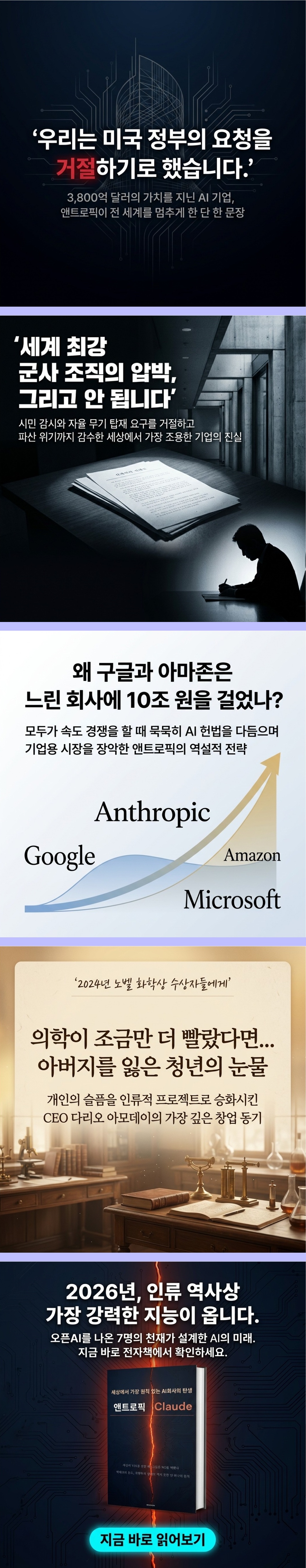 앤트로픽의 창업 배경부터 클로드의 탄생, 구글과 아마존의 대규모 투자, 안전 철학과 현실의 충돌, 그리고 2027년 초인적 AI 도달을 예언하는 다리오 아모데이의 비전까지를 8개 챕터에 걸쳐 촘촘하게 다룬다. 이 책은 단순한 기업 소개서가 아니다.