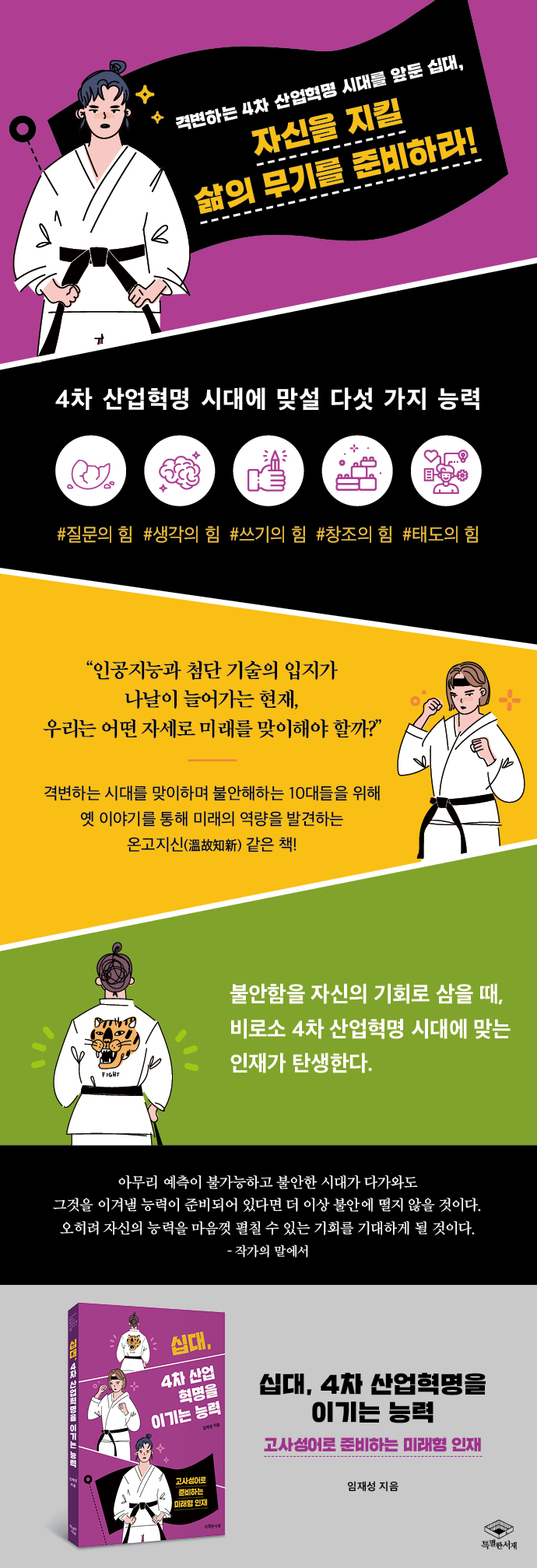『십대, 4차 산업혁명을 이길 능력』은 격변하는 시대를 맞이해 불안해하는 10대들을 위해 ‘4차 산업혁명을 이길 능력’을 귀띔해주며 독특하게도 과거의 산물인 고사성어를 통해 설명한다. 고사성어와 미래 사회의 만남은 다소 낯설게 느껴지지만, 세월이 흘러도 우리 곁에서 지혜를 선물하는 고사성어를 통해 인재가 되는 비결을 발견한다는 의미가 있다.