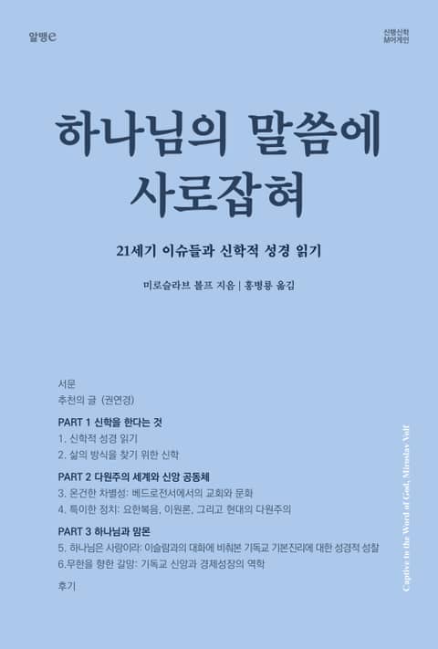 “기독교는 나이 들고 어리석은 자들이나 믿는 종교” 취급을 받던 사회주의 세계에서 어린 시절을 보낸 볼프, 전쟁과 인종청소 현장에서 “그리스도인은 깨어진 세상 속에서 어떻게 살아야 하는가?”라는 질문을 안고 씨름해 왔다. 그는 이 책에서 성경의 명령을 주입하기보다 종교를 초월한 성경 읽기의 유익과 삶의 방식을 배우기 위한 신학 하기, 타인을 비판하지 않고 그리스도인의 정체성을 찾기 등 흑과 백을 나누는 이원론이 아닌 다양한 성경 해석의 모델을 보여주고 있다. 볼프 박사는 이 작은 책에서 지구적 차원의 교회의 통일과 종교간 대화에 대한 깊이 있는 사상을 맛보여 준다. 심오하지만 쉽게 다가가기 어려운 볼프의 신학 세계를 경험하기 원하는 독자들에게 이 책은 멋진 초대장이 될 것이다.