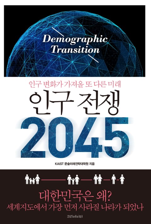 KAIST 미래학 연구기관인 문술미래전략대학원이 펴낸 《인구 전쟁 2045》는 우리나라 앞에 닥친 다양한 위기 가운데 가장 먼저 돌파해야 할 인구 변화에 관해 연구했다. 저출산과 고령화 현상으로 인구 절벽을 넘어 인구 붕괴를 우려하고 있는 지금, 미래 인구 변화에 따른 다양한 시나리오와 선진국의 인구 정책 연구 등을 통해 우리나라의 인구 정책이 나아가야 할 방향을 제시했다. 이 책을 통해 국가 간 전쟁보다 더 치열한 대한민국의 인구 전쟁 속에서 미래 위기와 시대 변화에 누구보다 먼저 대비할 수 있는 기회가 되길 바란다.