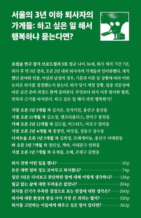 솔직한 질문과 후기가 담겨있어 좋았습니다. 자영업을 꿈꾸는 사람이라면 꼭 읽어봐야할 책이네요.