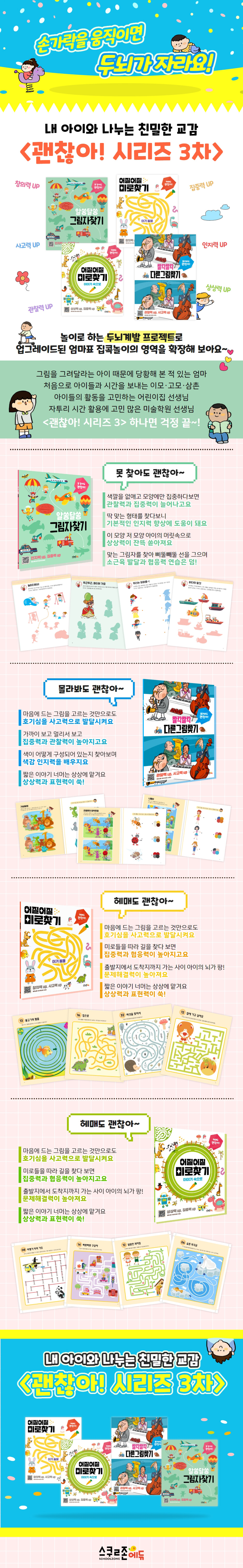 [괜찮아! 시리즈]는 놀이로 하는 두뇌계발 프로젝트입니다. 종이접기, 선긋기, 숨은그림찾기, 빠진그림찾기, 색칠하기, 그림자찾기, 다른그림찾기, 미로찾기 등으로 구성하여 유아기 아이들에게 꼭 필요한 소근육 발달, 관찰력 향상, 집중력 기르기, 상상력과 표현력을 확장하기 위해 기획되었습니다. 시리즈명처럼 서툴러도, 손재주가 없어도, 정확하지 않아도, 못 찾아도, 몰라봐도 다 괜찮은 놀이책입니다.