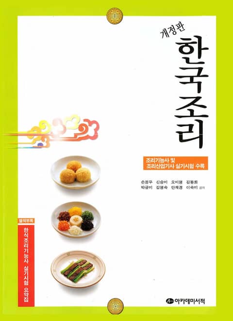 한국산업인력공단에서 시행하는 한국 조리기능사 및 산업기사 실기 대비 수험서 개정판. 이 책은 한국 음식 문화 형성의 배경과 특징 및 조리법을 상세하게 설명하고 있다. 또한 계승되어져 온 상차림과 명절음식 및 시식을 식사예절과 함께 수록하고 있다. 한식 조리사 시험에 대비한 최신 실기 문제와 유의사항 뿐 아니라 실제 조리 시 필수적인 요령을 함께 소개했다. 부록으로 한국조리 기능사 실기 시험 요약집을 별도의 책으로 정리해 두었다