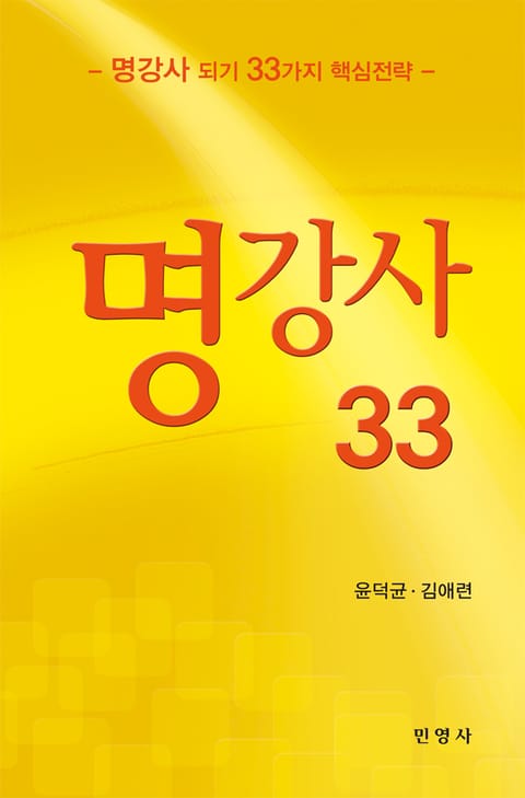 명강사 되기 33가지 핵심전략 『명강사 33』. 저자들이 오랜 시간 학교교육 이외의 평생교육기관과 산업체에서 강의를 해 온 교육적 경험을 바탕으로 사회강사로서 성공할 수 있는 구체적인 방법을 소개한 책이다. 앞으로 사회강사를 꿈꾸는 사람들과 현재 사회교육 강사로서 활동하고 있는 강사들에게 올바른 가이드를 제시한다. 또한사회강사가 되는 기본 노하우를 하나하나 익혀 나감으로써 인생 2기에서의 새로운 자아성취는 물론 후대를 위한 지식사회 건설에 이바지한다는 자부심을 가질 수 있도록 안내한다