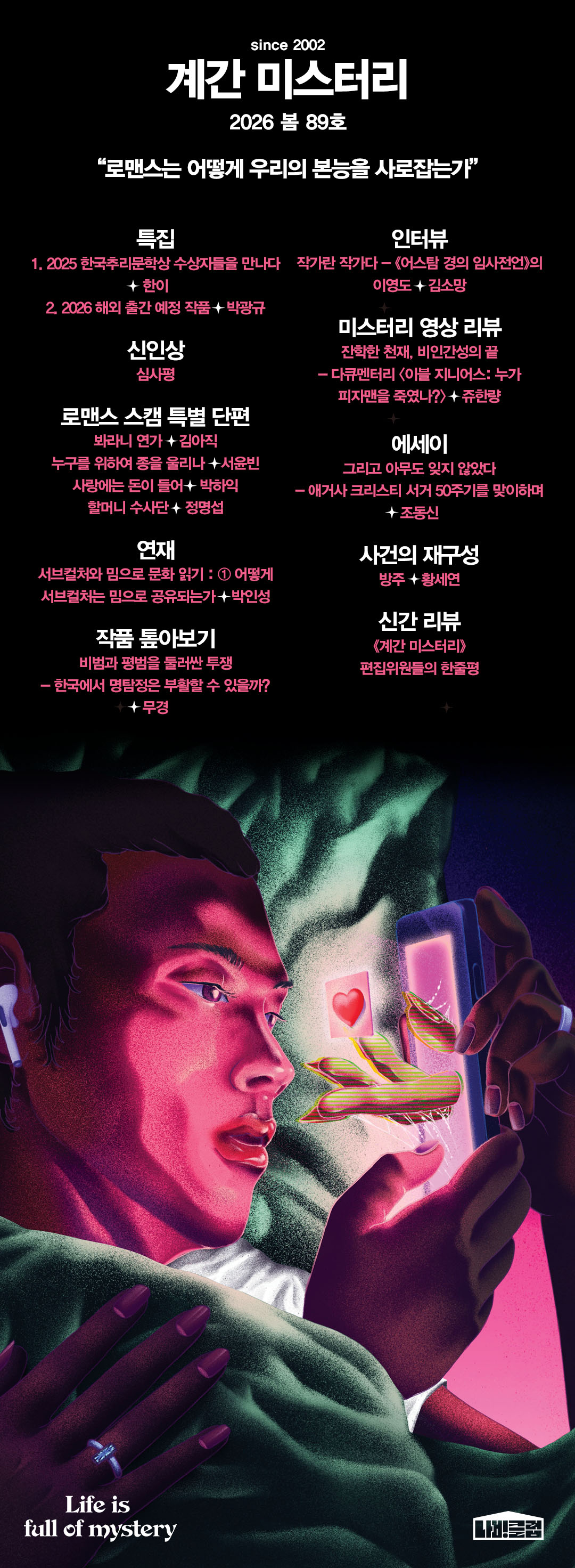 2026년 첫 《계간 미스터리》 특집은 〈2025년 한국추리문학상 수상자들을 만나다〉로 시작한다. 각기 대상, 신예상, 황금펜상을 수상한 고태라, 김영민, 여실지, 박건우 작가를 만나 이야기를 나눴다. 수상작의 창작 배경과 작가적인 고민에 관한 다양한 이야기를 들을 수 있다.