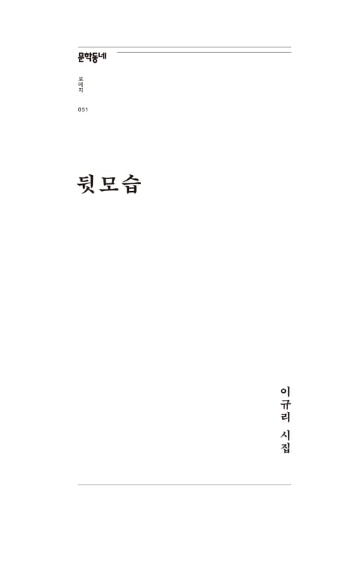 “생애의 저음부를 향한 별별 상상력의 세계”(김수이) 이규리 시인의 두번째 시집 『뒷모습』을 문학동네포에지 51번으로 다시 펴낸다. 2006년 처음 선보인 이후 16년 만이다. “말(馬)은 없고 말(言)이 많으니 그 수레 멀리 가진 못하겠다”(초판 시인의 말) 시인 스스로 달았으나 “참을성 많은 저녁”(개정판 시인의 말)의 곁에서 끝내 그 시간을 견뎌낸 시편들이다.