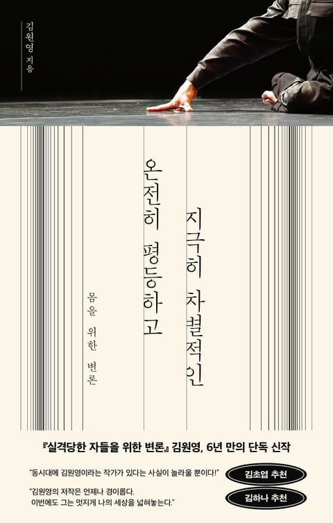 『온전히 평등하고도 지극히 차별적인』은 개인적인 경험과 춤의 역사를 경유하며 무대에서 잊힌 타자들의 존재를 복원하는 가운데, 김원영이 천착해온 차별과 평등의 관계를 탐구한 기록이다. 무용사에 ‘이례적’ 신체가 등장하는 사건을 조망하는 것을 시작으로 최승희, 니진스키 등 동서양 무용계 타자들을 호출하고 나아가 독자적 흐름을 창조해가는 20세기 후반 국내외 장애인 극단과 무용팀의 목소리까지 생생히 다뤄진다. 정상과 비정상, 다수자와 소수자, 동양과 서양 등 비대칭한 권력관계를 중심으로 몸에 새겨진 질서와 그 질서를 전복하는 현장을 들여다본 이 책은 각기 다른 몸들이 만들어갈 평등한 무대(공동체)를 위한 대담한 상상력을 제안할 것이다. 우리 몸에 새겨진 질서뿐 아니라 때로 그 질서를 살짝 비틀거나 새로운 질서를 짜는 것만으로 환대의 무대를 열 수 있음을 목격하는 덕분이다. 무엇보다 이 한 권의 ‘몸을 위한 변론’은 익숙한 질서 너머의 세상을 향하는 데 있어 종내 구체적인 몸들의 가능성에 주목해야 한다는 사실을 환기한다. ‘몸에 대한 신뢰’ 없이 ‘자신에 대한 신뢰’는 불가능하며, 스스로 몸과 맺는 관계는 공동체와 맺는 관계의 바탕이 되기 때문이다.