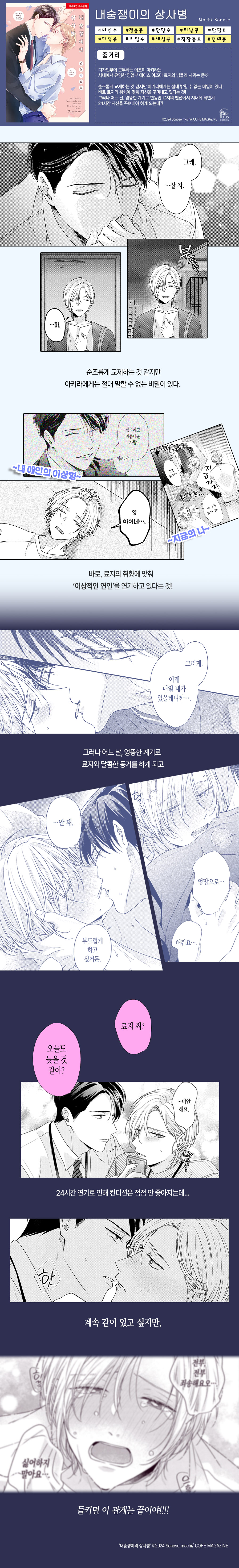 둘이 진짜 천생연분이고 귀엽습니다.. 너무 러브러브한 거 단조롭게 느끼시는 분들은 심심하실 수도 있어요! 작가님 그림체 예쁘고 담백한데 인체 잘 그리셔서 신작 나오면 대여는 꼭 하게 되는 것 같아요!