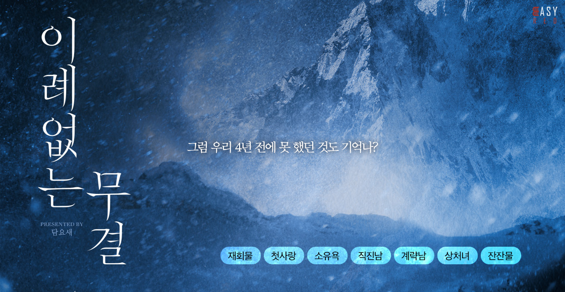 *키워드: 동거, 조직/암흑가, 전문직, 오해, 복수, 권선징악, 재회물, 첫사랑, 몸정>맘정, 소유욕/독점욕/질투, 운명적사랑, 동정남, 능력남, 뇌색남, 재벌남, 직진남, 계략남, 능글남, 유혹남, 절륜남, 집착남, 후회남, 상처남, 순정남, 까칠남, 무심남, 오만남, 뇌섹녀, 능력녀, 다정녀, 상처녀, 동정녀, 순진녀, 무심녀, 잔잔물, 성장물, 애잔물, 고수위