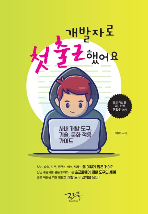 이 책은 마정석이라는 신입 개발자가 첫 출근했을 때를 가정해 첫 프로젝트를 마칠 때까지 적응해야 하는 거의 모든 툴에 대한 퀵 가이드이다. 간단한 사내 커뮤니케이션 툴부터, 협업, 설계, 코드 작성, 코드 관리, 테스트, 모니터링, 코드 배포 등 프로젝트 전 과정에서 쓰이는 툴의 핵심 사용법과 주의사항을 다루고 있다. 개발 프로젝트의 한 사이클을 살펴볼 수 있고 주요 기술이나 개발 문화에 대한 가이드도 구석구석 다루고 있어 예비 개발자나 신입 개발자가 개발 현장에 빠르게 적응할 수 있도록 도와주는 든든한 참고서가 되어줄 것이다.
