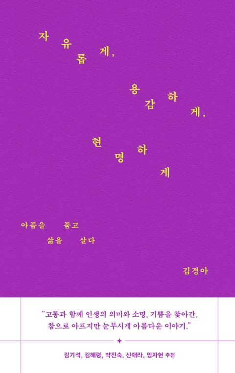 김경아는 대학에서 만난 동아리 선배와 결혼하여 두 딸을 낳고 막내딸을 입양한, 세 아이의 엄마입니다. 또한 세 권의 책을 펴낸 작가이자, 성교육과 반편견 입양교육 강사로도 활동했습니다. 대학 1학년 가을, 류마티스 관절염이 찾아온 것을 시작으로 평생 여러 자가면역질환과 함께했습니다. 이 경험은 그가 고통과 죽음을 깊이 사유하며 글을 쓰는 계기가 되었습니다. 2025년 2월 17일, 55세 생일을 8일 앞두고 세상 을 떠나는 날까지 그는 삶과 고통, 인간에 대한 섬세하고 날카로운 통찰로 많은 이들의 삶에 깊은 흔적을 남겼습니다. 이 책은 그의 네 번째 책이고 유작이 되었습니다. 『너라는 우주를 만나』, 『성을 알면 달라지는 것들』, 『자유롭게, 용감하게, 현명하게』 등의 저서와 『헤아려 본 믿음』 등 여러 권의 역서가 있습니다.