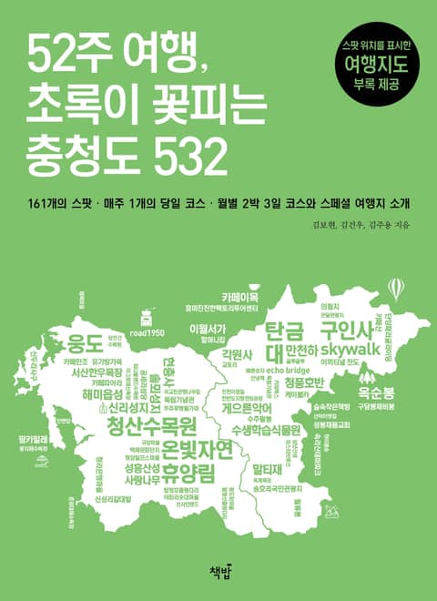 ‘52주 여행’ 시리즈는 1월 첫 주부터 12월 마지막 주까지, 매주 그때의 시기와 딱 맞는 여행지를 소개한다. 이번에는 많이 알려지지 않은 충청도다. 전국 어디서 출발하든 부담 없이 여행할 수 있는 거리에 있을 뿐만 아니라 곳곳에 숨겨진 여행지가 많은, 초록이 꽃피는 충청도의 다양한 모습 담았다. 여행을 사랑하는 현지인이 충청도의 보물 같은 명소를 엄선하여 정리한 것이니 의심할 필요가 없다. 높은 산과 푸른 바다가 있어야 아름다운 것은 아니다. 초록으로 덮인 땅이 낮게 이어지는 것만으로도 충분히 아름다운 이곳은 그동안 크게 주목받지 못했던 충청도다. 눈에 띄는 기암절벽과 철썩거리는 파도가 있다면 강원도나 제주도만큼 주목받았겠지만, 소소한 멋을 가졌기에 그만큼 묵묵히 우리 곁에 있다. 하루에 두 번 바다에 잠긴다는 웅도 유두교, 내 키보다 더 큰 팜파스가 자라는 청산수목원, 국내인지 해외인지 구분되지 않는 수생식물학습원을 비롯해 이름만 들어도 핫한 말티재, 청풍호반케이블카, 게으른악어, 구인사 등 직접 가보지 않고는 풍광을 논할 수 없는 여행지 532군데를 담았다. 아무 계획 없이 훌쩍 떠나고 싶다면, 혹은 충청도에 살면서도 여기저기 다녀보지 못했다면 고민하지 말고 1년 내내 순서대로 방문해 보자! 쉼표가 필요한 우리들의 삶이 좀 더 풍성해질 것이다.