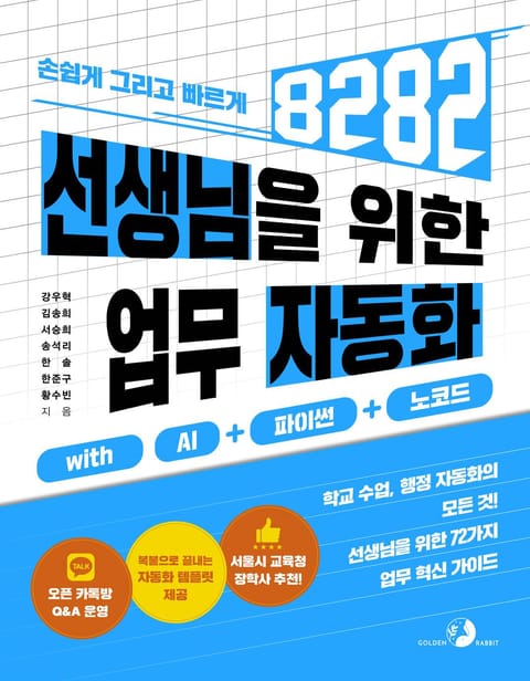 선생님의 업무 부담을 획기적으로 줄여줄 실전 가이드, 《선생님을 위한 8282 업무 자동화》가 출간되었습니다. 이 책은 교육 현장에서 꼭 필요한 행정 업무, 출석 관리, 상담 기록, 문서 작성 등을 자동화하는 방법을 바로 사용할 수 있는 실무 중심으로 안내합니다. 자동화 경험이 없는 선생님도 쉽게 따라 할 수 있는 노코드 도구부터, 파이썬 코드까지 단계별 실습을 제공합니다. 코드를 다 이해하지 않아도 괜찮습니다. 챗GPT와 같은 생성형 AI를 활용해 자동화 코드를 만드는 방법도 알려드리니 걱정하지 마세요. 복붙으로 바로 쓸 수 있도록 자동화 파일도 제공합니다.