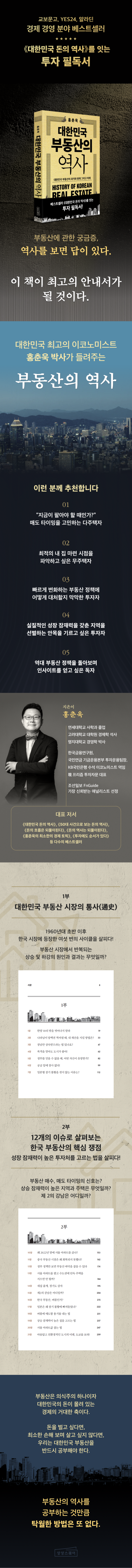 ⟪대한민국 부동산의 역사⟫는 한국 경제의 핵심인 부동산의 과거와 현재 그리고 미래를 조망하는 책이다. 조선일보와 FnGuide가 선정한 가장 신뢰받는 애널리스트이자, 최고의 이코노미스트로 꼽히는 홍춘욱 박사가 깊은 안목과 풍부한 사례를 바탕으로 부동산 투자의 핵심을 꿰뚫는 통찰을 선사한다.
