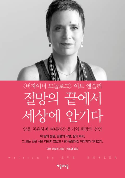 여성의 성을 적나라하게 이야기하며 세상을 도발한 <버자이너 모놀로그>와 <필요한 목표물> <굿 바디> 등의 희극 작품, 『나는 감정이 있는 존재입니다』와 『마침내 불안정한』 등의 정치적 회고록을 남긴 베스트셀러 작가이자 오비 상Obie Awards 등을 수상한 극작가 이브 엔슬러. 『뉴스위크』의 ‘세계를 바꾼 150명의 여성’ 중 한 명에 선정되기도 한 그녀가 고통스러웠던 7개월간의 자궁암 투병을 토대로 한 회고록 『절망의 끝에서 세상에 안기다』를 펴냈다(원제: In the Body of the World: A Memoir of Cancer and Connection).