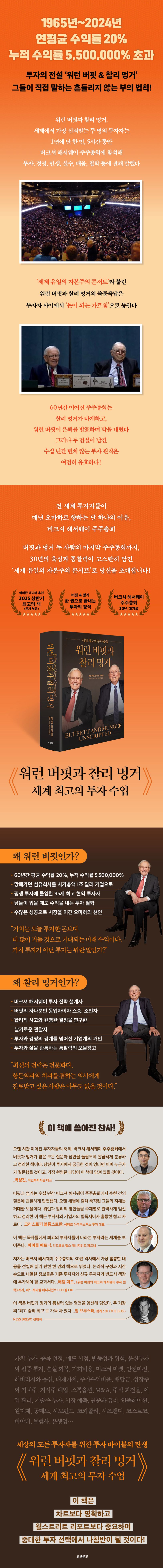 이제 더는 버핏과 멍거의 생생한 투자 조언을 들을 수 없지만, 최고의 위치에서 물러난 두 전설이 남긴 가르침은 여전히 유효하다. 전문 투자자 알렉스 모리스는 투자와 비즈니스의 보물 창고와 같은 버핏과 멍거의 주주총회 내용을 모두 청취했고, 두 사람의 발언 중 지금도 유효한 조언들을 선별했다. 이 책은 지난 30년간 버핏과 멍거가 주주총회에서 수천 건의 질문에 친절하게 답변한 내용을 주제별로 정리한 것이다.