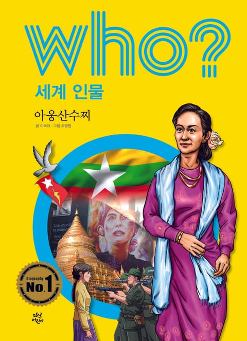 아웅산수찌는 어린 시절부터 줄곧 외국에서 생활했지만, 늘 조국 버마(현재의 미얀마)와 조국의 영웅인 아버지 아웅산의 딸인 것을 자랑스럽게 생각했어요. 어른이 되어서는 영국에서 남편과 두 아들을 두고 평온하게 살고 있었지요. 하지만 버마에서 벌어지는 ‘8888 항쟁’을 직접 목격하며 아웅산수찌의 삶은 달라졌어요. 자국의 군대가 국민을 죽이는 참혹한 현장에 선 그녀는 이제 버마의 민주주의를 위해 앞장서기 시작했습니다. 군대의 총부리 앞에서도 굴하지 않았고, 15년 남짓한 기간 동안 자신의 집에 갇혀서도 용기를 가지라며 사람들을 이끌었어요. 아웅산수찌의 투쟁으로 전 세계는 미얀마에서 벌어지는 잔인한 독재 정치에 대해 알게 되었습니다. 결국 민주화 운동과 국제 사회의 압박을 이기지 못한 독재 정부는 단계적 민주화를 약속했지요. 현재 미얀마에는 민간 정부가 들어섰고, 아웅산수찌 역시 가택 연금에서 풀려나 미얀마에 민주주의가 뿌리내릴 수 있도록 노력하고 있습니다.