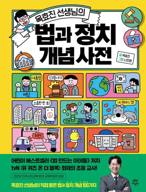 이 책은 아이들의 일상인 학교와 가정, 친구 관계 속에서 법과 정치 개념을 쉽고 재밌게 풀어냈다. 솔이와 탄이가 등장하여 민사·형사, 여당·야당, 보수·진보, 표결·가결 등 다양한 법·정치 개념에 대해 호기심을 나타내면, 친절한 옥쌤이 아이들의 눈높이에서 차근차근 설명해 준다. 또 애교쟁이 강아지 멍이와 새침한 고양이 냥이가 등장해 아이들이 어려워할 만한 법·정치 개념을 빗대어 설명하여 더 재밌게 익히도록 도와준다. 친구같은 캐릭터들과 함께 차례차례 개념을 익히다 보면 우리 사회가 어떻게 구성되고 움직이는지 통찰할 수 있는 사회 문해력이 쑥쑥 자랄 것이다.
