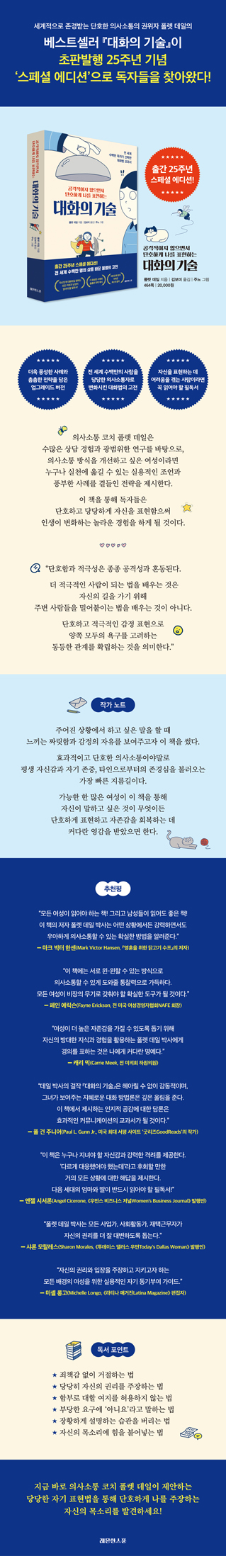- 세계적으로 존경받는 단호한 의사소통의 권위자 폴렛 데일의 베스트셀러 『대화의 기술』이 초판발행 25주년 기념 ‘스페셜 에디션’으로 독자들을 찾아왔다!