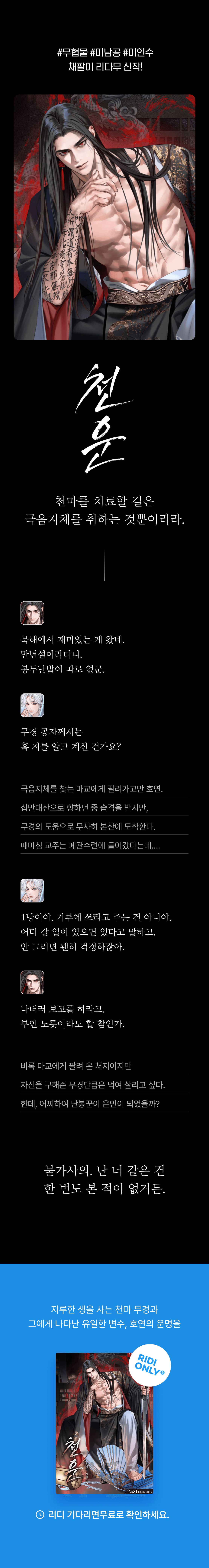 n년 무협러라 갈!하게 되는 무협벨이 많아서 불안합니다만.. 갓채팔 믿고 갑니다! 그런데 40화 런칭은 너무 잔인해요ㅠㅠㅠ 어떻게 기다린담ㅠㅠㅠ