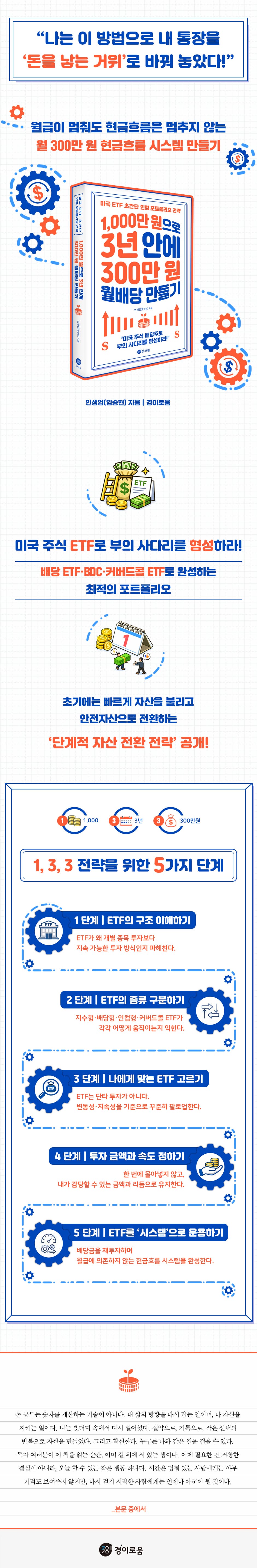 이 책은 다양한 ETF의 구조와 종류부터 원리, 세금과 리스크까지 현실적으로 짚어주며, 독자가 스스로 포트폴리오를 설계할 수 있도록 돕는다. 중요한 것은 ‘한 방’이 아니라 지속 가능한 조합이며, 배당금을 다시 굴려 시간이 지날수록 커지는 복리형 현금흐름을 만드는 것이다. 이 책은 지금 가진 돈이 크지 않아도, 당장 시작할 수 있는 분명한 방향이 되어줄 것이다.