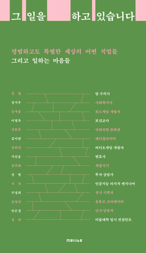 국회의원 보좌관, 변호사, 사회복지사, 보건교사, 책방지기, 말 수의사, 보드게임 개발자, 비디오게임 개발자, 메디컬라이터, 인공지능 리서치 엔지니어, 유튜브 크리에이터, 미술대학 입시 컨설턴트, 전시 기획자, 투자 상담가, 인사 담당자 등 이 책에 참여한 열다섯 명의 직업인들 면면은 다채로우며 경력도, 일하는 현장이나 일의 성격도 모두 다르다. 다만 그 일이 무엇이든 자신의 자리에서 묵묵히 그리고 최선을 다해 하루하루를 살아가며 고유의 가치를 찾고 있다는 점만은 같다. 그 일을 하고 있는 사람만이 느끼고 알 수 있는 기쁨과 슬픔, 평범하면서도 특별한 그 일의 의미를 진솔하게 펼쳐 보인 글들을 통해 우리의 하루 대부분을 차지하고 있는 일하는 시간과 마음에 대해서 다시 한 번 생각해볼 기회가 될 것이다.