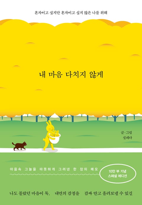 솔직하면서도 담담한 글과 공감을 불러일으키는 그림으로 많은 독자들에게 사랑을 받아온 『내 마음 다치지 않게』의 스페셜 에디션이 출간되었다. 저자는 조그마한 노란색 포스트잇에 자신의 마음을 진솔하게 담아내는 것을 시작으로, 10년이 넘도록 토끼 캐릭터 ‘설토’를 통해 수많은 감정에 대한 이야기를 전하고 있다.
