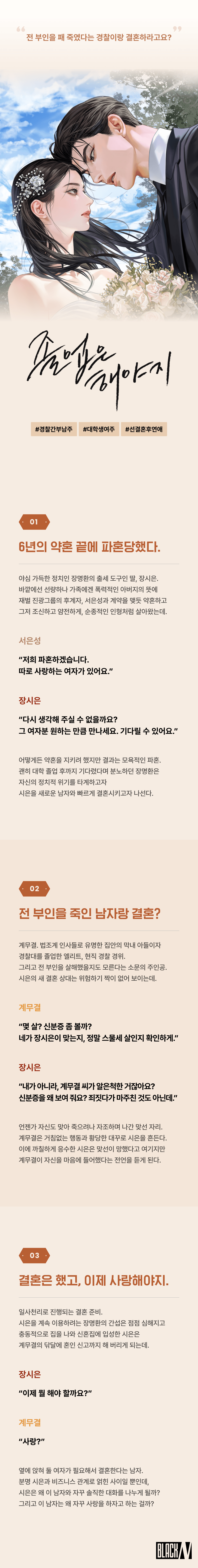 전 부인을 죽이고도 기소조차 되지 않았다는 불미스러운 뒷말이 꼬리표처럼 따라다니는 경찰 계무결. 서로가 조건 맞아 결혼하는 일종의 비즈니스에 사랑이 왜 필요한지 이해하지 못하는 무미건조한 아가씨 장시은. 두 사람의 관계와 스토리 전개가 기대됩니다.