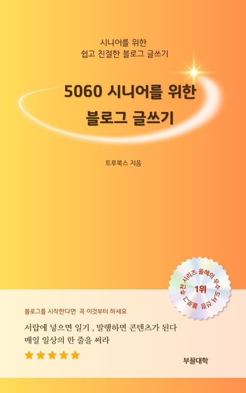 5060 시니어를 위한 블로그 글쓰기 는 막막한 글자 수의 압박과 디지털 장벽 앞에서 주춤했던 분들을 위한 가장 친절한 안내서입니다. 좋은 글 이미지 상위 1% 블로거이자 전문 강사인 트루북스가 직접 겪은 디지털 울렁증 극복기와 실전 노하우를 가득 담았습니다.