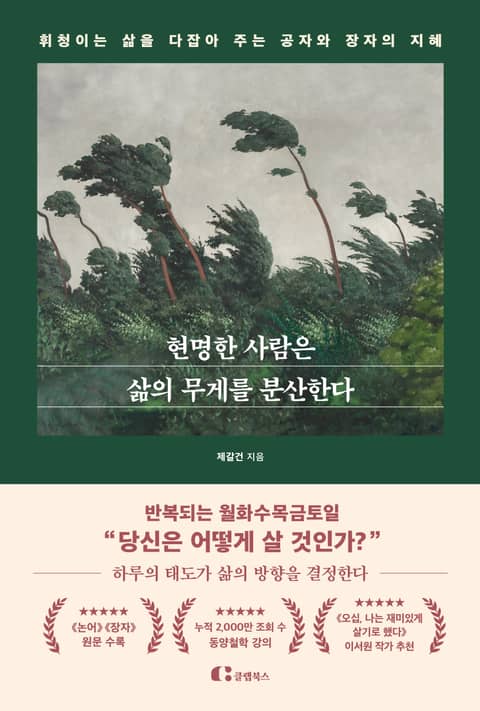 《논어》와 《장자》를 함께 읽어야 하는 이유도 균형에 있다. 동양철학의 양대 산맥인 유가 철학과 도가 철학을 함께 읽으면 동양철학은 진지하면서 지루하지 않고 풍요로우면서 핵심을 짚게 된다. 마음이 해이해질 땐 공자의 말로 질서를 잡고, 불안이 밀려올 땐 장자의 말로 긴장을 해소해 보자. 삶에 필요한 중용과 변화를 불러일으킬 것이다. 저자는 싸움으로 10대를, 알코올 중독으로 20대를 보냈다. 그가 오랜 방황에 마침표를 찍을 수 있었던 것은 두 철학자의 지혜를 일상에 적용한 덕분이다. 공자와 장자는 먼지와 때가 왜 묻게 되었는지 알 수 없듯이 ‘왜 살며 왜 죽는가’를 말할 수 있는 사람은 없다고 말한다. 그러므로 우리가 해야 할 일은 먼지와 때가 묻지 않도록 조심하는 일, 이미 묻은 먼지와 때를 닦아 내는 일이다. 모두에게 주어진 월화수목금토일을 당신은 어떻게 살고 싶은가? 더 나은 하루하루를 쌓기 위한 힌트가 이 책에 있다.