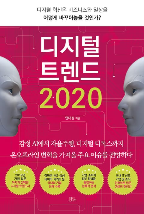 《디지털 트렌드 2020》은 믿을 수 있는 확실한 정보로 디지털이 불러올 특이점을 최대한 쉽게 전하기 위해 노력했다. 시장에서 수년 이상 검증된 업체, 수개월 이상 관찰을 통해 확인된 실험을 중심으로 다루었으며, 최대한 많은 부분을 직접 검증했다. 아마존·MS·삼성·네이버·카카오 등 국내외 기업의 전략을 수록하고, 국내 IT 선도 기업 및 조직과의 인터뷰를 담아 생생한 현장감도 놓치지 않았다. 급변하는 시대 흐름에 맞춰 미래를 준비하려는 모든 이에게 이 책은 빠르고 정확한 시각을 제공할 것이다.