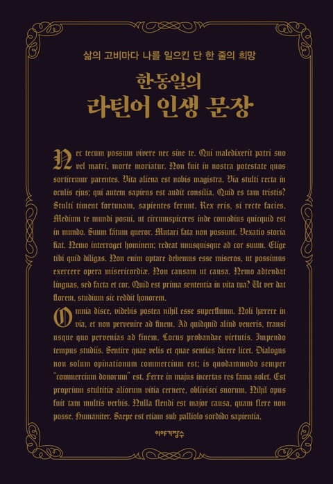 그러나 가난한 집안의 소년 한동일이 바티칸 대법원의 변호사가 되기까지―수없이 고난에 직면하면서 스스로에게 실망하고 가족과 주변 사람들에게 실수하다가도 끝내 그의 재능을 알아봐주는 스승을 만나 꿈에 한 발씩 다가서온 한동일의 인생 스토리는 지금까지 잘 알려져 있지 않았다. 이 책은 라틴어 잠언집인 동시에 한동일 작가의 뜨거운 고백록이기도 하다.