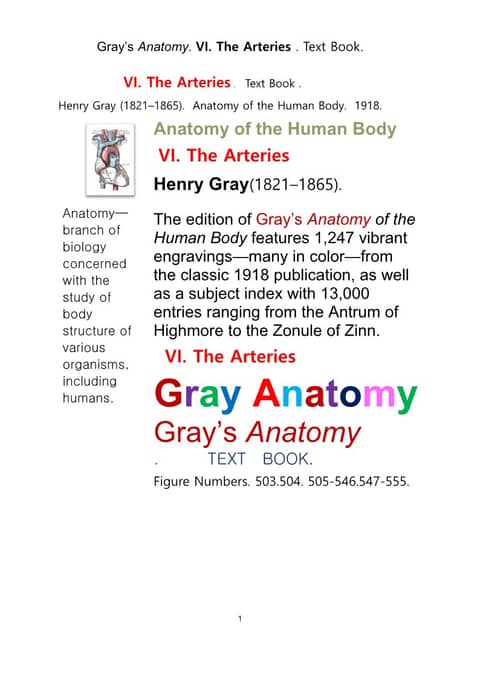 그레이아나토미 해부학의 제6권 동맥 책.Gray’s Anatomy. VI. The Arteries . Text Book.by Henry Gray.