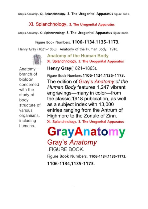 그레이아나토미 해부학의 제11권 3부 비뇨생식기 학 도해 그림책.Gray’s Anatomy. XI. Splanchnology. 3. The Urogenital Apparatus Figure Book,by Henry Gray