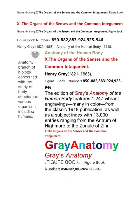 그레이아나토미 해부학의 제10권 감각기관및 외피外皮학 도해 그림책.Gray’s Anatomy . X. The Organs of the Senses and the Common Integument Figure Book by Henry