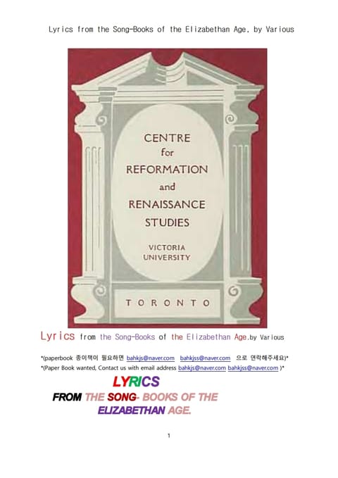 영국 엘리자베스 여왕시대의 노래가사 서정시들. Lyrics from the Song-Books of the Elizabethan Age, by Various