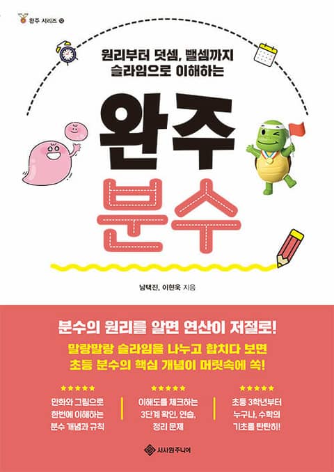 『완주 분수』는 분수에 어려움을 겪는 친구들을 위해, 아이들이 좋아하는 ‘슬라임’으로 분수 개념을 시각화하였습니다. 추상적인 분수를 슬라임 캐릭터 ‘수라임’을 통해 눈에 보이고, 손에 쥐어지고, 머릿속에 그릴 수 있는 구체적인 대상으로 재탄생시켰지요. 진분수, 가분수, 대분수, 단위분수와 분수의 연산까지! 슬라임들이 자유자재로 나누어졌다가 합쳐지며 다양한 분수의 개념을 표현합니다. 그림과 만화를 보는 것만으로도 자연스레 분수의 원리가 이해되는 신기한 경험을 할 수 있을 거예요.