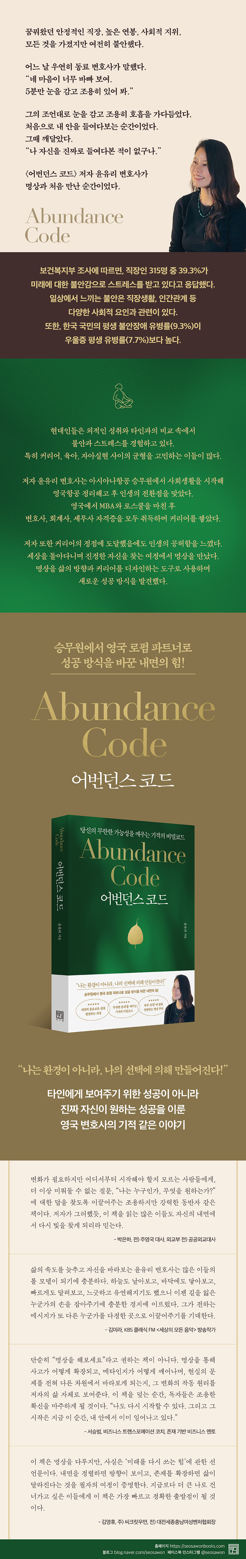저자는 명상을 단순히 마음의 안정을 위한 도구가 아닌, 무한한 가능성을 현실화시키는 과학적·전략적 장치로 다룬다. 명상은 불안과 공허함으로 가득 찼던 저자의 어린 시절을 밝은 빛으로 이끌었다. 그 빛은 ‘자신 내면에 있는 우주를 스스로 발현시키는 찬란한 순간’이었다. 이후 세계 곳곳을 찾아다니면서 배운 수련·양자물리학·의식 연구를 통합하여, 누구나 자신의 에너지를 회복하고 삶을 새로 설계할 수 있는 실천 가능한 의식경영 툴을 만들었다. 어번던스 코드는 저자의 30년 커리어, 20년 수련, 수십 번의 전환, 내면 깊은 곳에서 만난 ‘본래의 나’가 결합해 탄생한 시스템이다. 이 책은 그 코드의 핵심을 가장 전략적이고 실천적이며, 영적인 방식으로 담아낸 첫 번째 공식 작품이다.