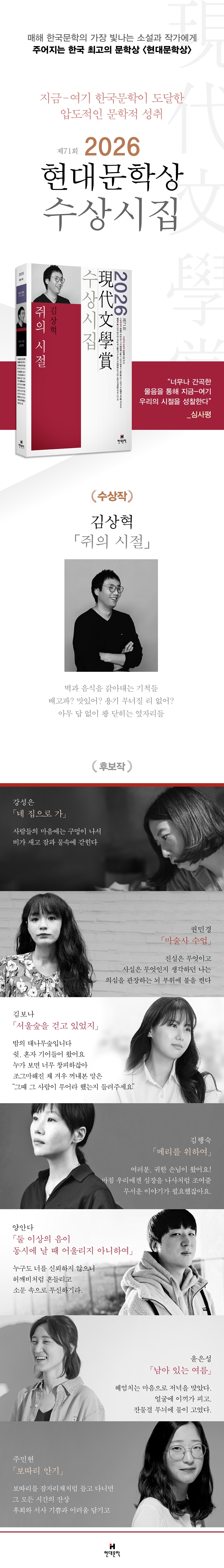 한국문학의 가장 빛나는 시와 시인에게 주어지는, 71회를 맞은 명실상부한 한국 최고 문학상인 <현대문학상>의 올해의 수상자와 수상작으로 김상혁의 「쥐의 시절」이 선정되었다. 심사는 2024년 12월호~2025년 11월호(계간지 2024년 겨울호~2025년 가을호) 사이, 각 문예지에 발표된 작품을 대상으로 진행되었으며, 수상후보작으로는 강성은 「네 집으로 가」 외 6편, 권민경 「마술사 수업」 외 6편, 김보나 「서울숲을 걷고 있었지」 외 6편, 김행숙 「메리를 위하여」 외 6편, 양안다 「둘 이상의 음이 동시에 날 때 어울리지 아니하여」 외 6편, 윤은성 「남아 있는 여름」 외 6편, 주민현 「보따리 안기」 외 6편이 선정되었다.