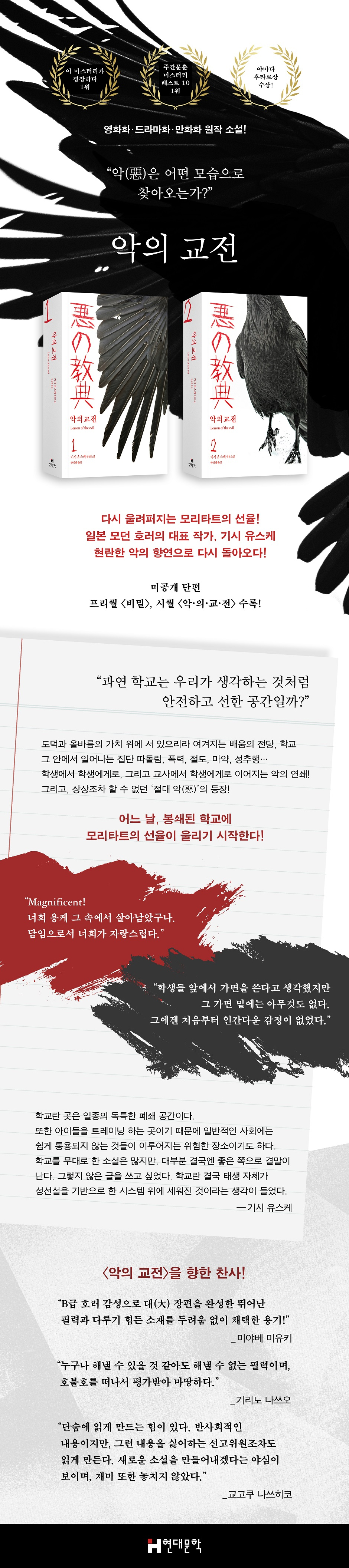 일본 모던 호러의 대표 작가, 기시 유스케의 『악의 교전』이 현대문학에서 재출간 된다. 『악의 교전』은 우리가 ‘선하고 안전한’ 공간이라 인식하는 학교가 “정말 그러한 곳인가?”라는 의문과 함께 시작한다. 소설 속 등장하는 학교는 이미 도덕적 올바름은 잃은 지 오래. 배움의 전당이라는 허울만 남은 학교 안에서 일어나는 집단 따돌림, 폭력, 절도, 마약, 성추행 등. 학생에서 학생에게로, 그리고 교사에서 학생에게로 이어지는 악의 연쇄 속으로 상상조차 할 수 없던 ‘절대 악(惡)’이 등장한다. 천사의 얼굴을 하고 학교를 조종하는 영어교사 하스미 세이지. 그리고 하스미는 아주 사소한 계기로 다시 연쇄살인마로 각성하게 되는데…….